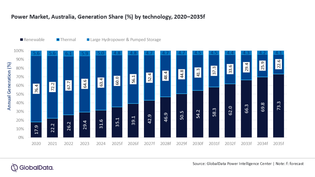 GlobalData’s latest report, “Australia Power Market Trends and Analysis by Capacity, Generation, Transmission, Distribution, Regulations, Key Players and Forecast to 2035,” reveals that renewables will also dominate Australia’s capacity mix, reaching 77.8% by 2035. This marks a significant shift from 2024, when renewables accounted for 48% of installed capacity and 31.6% of generation, while thermal power represented 44% of capacity and 63.4% of generation.